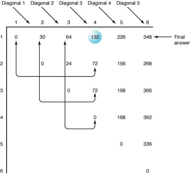 Compute Diagonal 3: M[1][4]는 네 개의 행렬을 곱할 때의 연산횟수를 계산한 값이다. 앞서 구한 M[1][2], M[2][4], …, M[1][3] 등이 계산에 이용된다. 값을 재계산하지 않고 찾아서 재사용하는 것이 동적계획법의 특징이다. M[2][5] and M[3][6] 값들 역시 같은 방법으로 계산한다.
