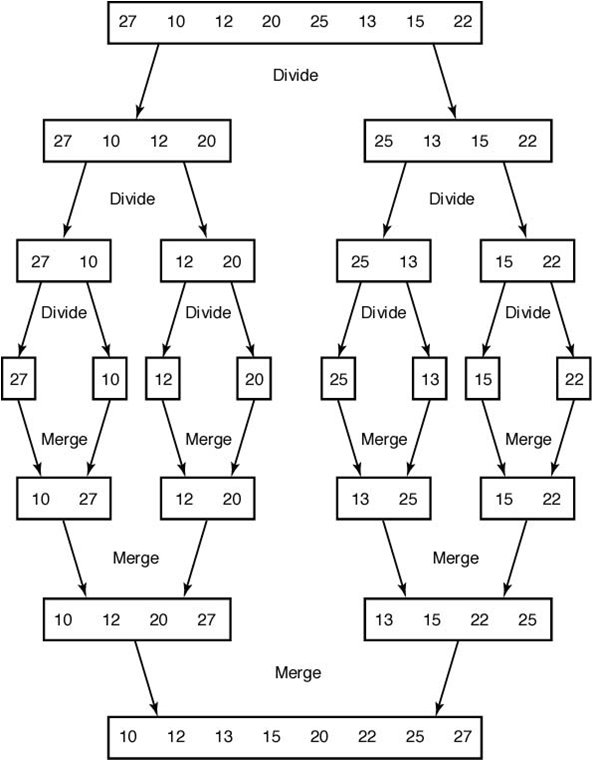 A process related to sorting is merging. By two-way merging we mean combining two sorted arrays into one sorted array. By repeatedly applying the merging procedure, we sort an array. For example, to sort an array of 16 items, we can divide it into two subarrays, each of size 8, sort the two subarrays, and then merge them to produce the sorted array. In the same way, each subarray of size 8 can be divided into two subarrays of size 4, and these subarrays can be sorted and merged. Eventually, the size of the subarrays will become 1, and an array of size 1 is trivially sorted. This procedures is called Mergesort.