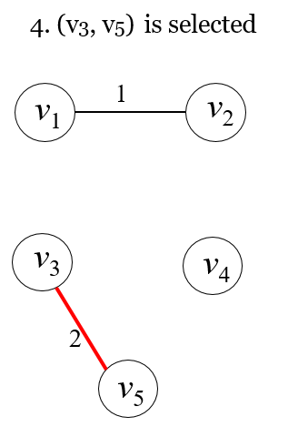 Step 4 ์ต์๊ฐ์ค์น๋ฅผ ๊ฐ๋ ์ด์์ ์ผ๋ก $v_3$์ ์ ๊ณผ $v_5$์ ์ ์ ์ฐ๊ฒฐํด์ฃผ๋ 2๊ฐ ์ ํ๋๋ค. $v_3$๊ณผ $v_5$์ญ์ ์๋ก์ ์งํฉ์ด๋ฏ๋ก ๋ ์งํฉ์ ํ๋์ ๋ถ๋ถ์งํฉ์ผ๋ก ํฉ์น๋ค. ํ์ฌ๊น์ง์ ๋ถ๋ถ์งํฉ์ {$v_1$, $v_2$}, {$v_3$, $v_5$}, {$v_4$} ์ด๋ ๊ฒ 3๊ฐ์ด๋ค.